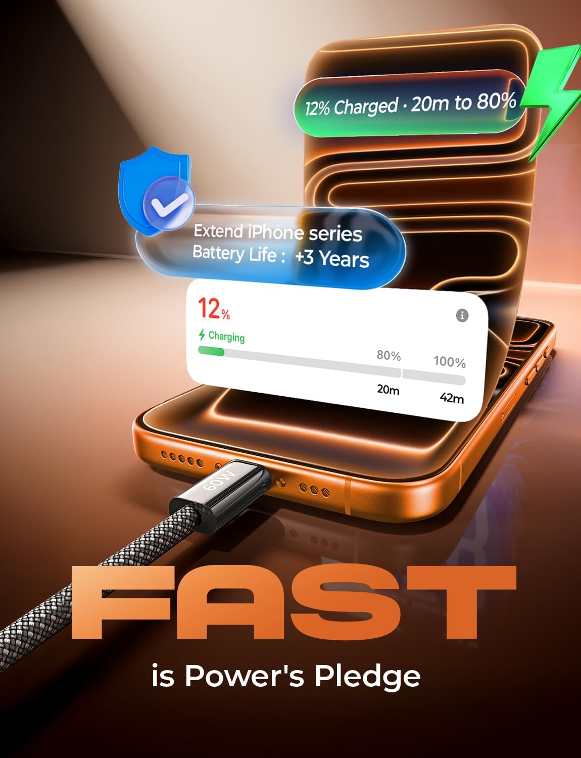 • 【60W Turbo Fast Charging】This iPhone 17 charger cord support PD3.0/QC3.0/QC4.0 fast charging up to 60W Max (20V/3A) with USB-C Power Delivery adapters such as 30W/45W/60W. Which 2.2X faster than 3.1A version and charges USB C Phone from 0% to 80% within 35 minutes, iPad Pro 64% within 35 minutes, Macbook air 50% within 35 minutes, and data transfer speeds up to 480Mbps (1200 songs synced per minute) compatible with Samsung,Tablt,iPad Air Mini Pro,Macbook and More.