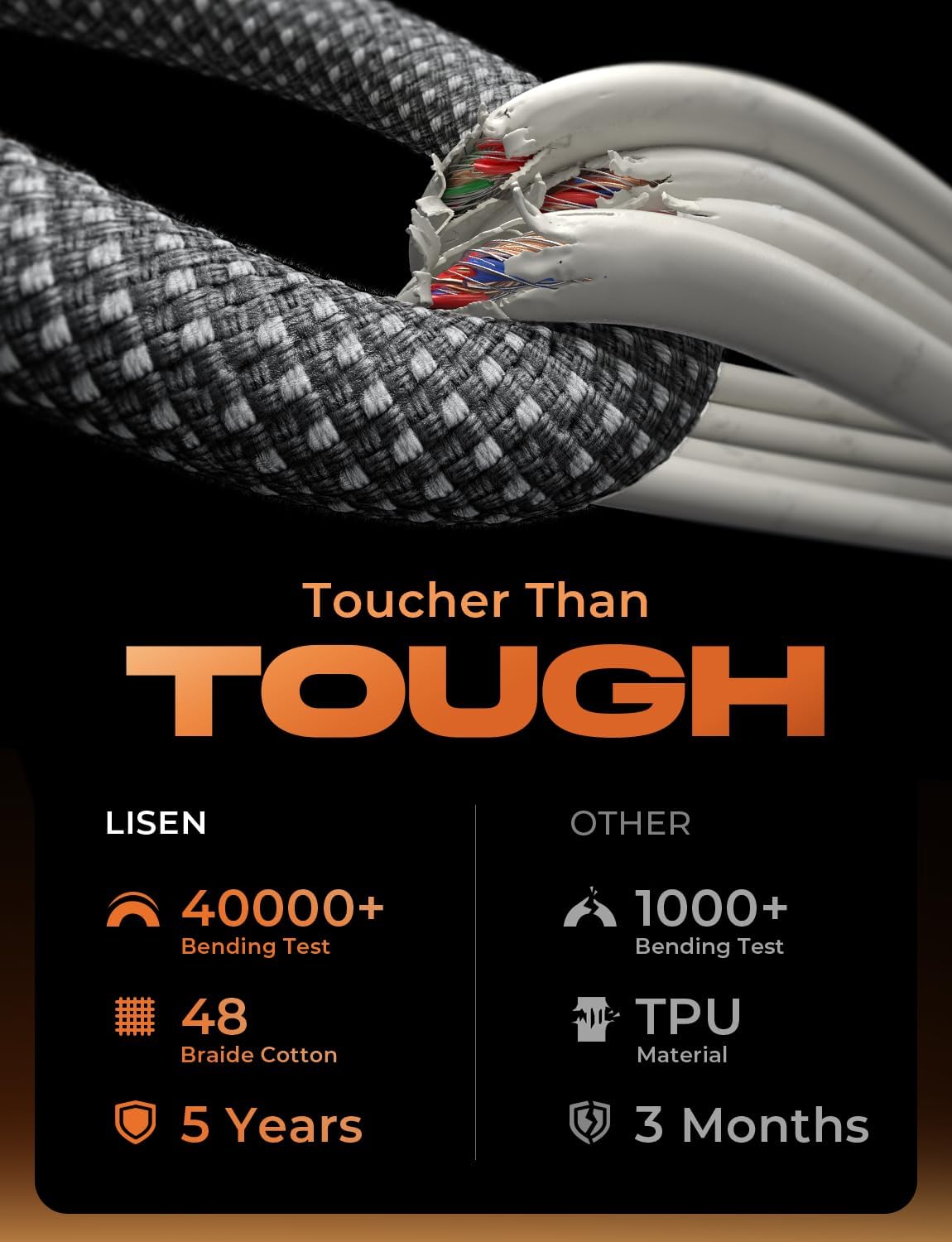 • 【Green Recyclable Materials】The LISEN USB C to USB C iPhone 17 16 15 charger fast charging you rely on most are braided from 48 strands of recyclable cotton yarn material. This braiding design also helps to prevent tangling and damage from bending and twisting. Using recycled materials is one of the ways we can lower the carbon impact of our products, since these materials often have a lower carbon footprint than materials from primary sources.