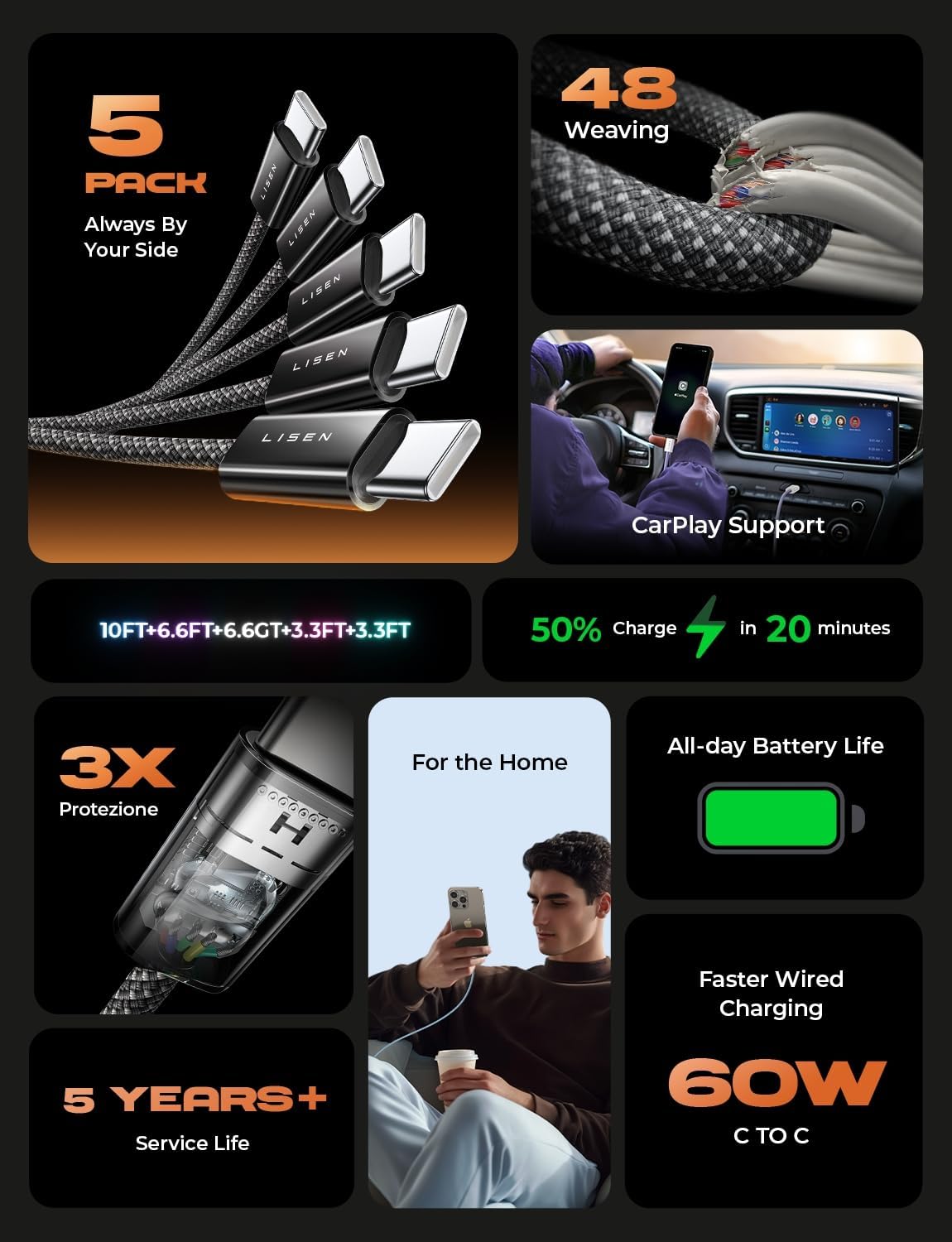 • 【What You Get】LISEN USB C to USB C Cable 5-Pack (3.3/3.3/6.6/6.6/10FT), 18-Month worry-free period and 24/7 customer service, if you have any questions, we will resolve your issue within 24 hours. Whether you’re shopping for samsung or iphone 16 pro max charger cord accessories gifts for men/women or reliable car accessories, this super fast charger usb c to c cable is built to last